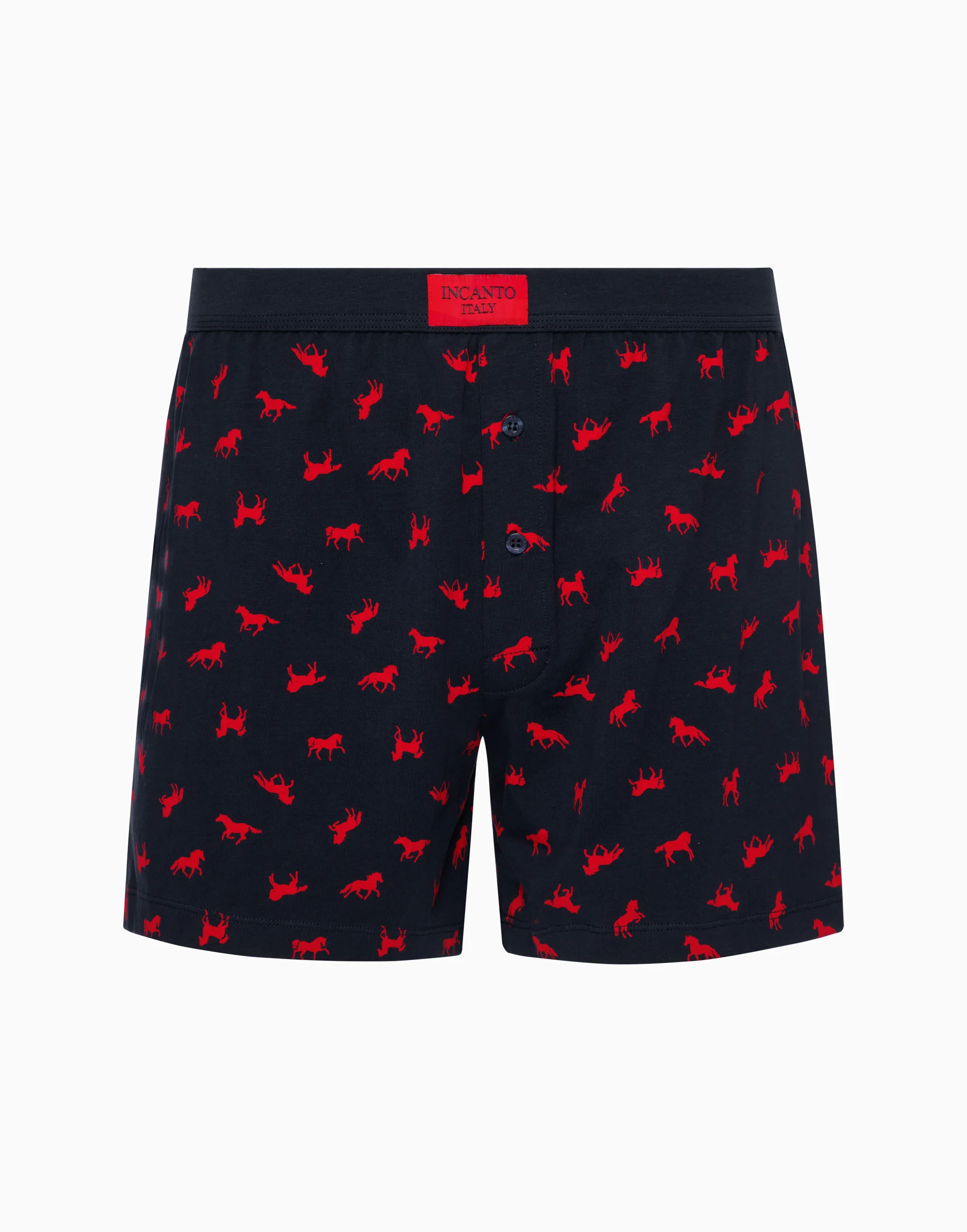 Изготовленные из высококачественного хлопка, они дарят невероятную мягкость при контакте с кожей и обеспечивают отличную воздухопроницаемость. Материал долговечен и прост в уходе, сохраняя форму и цвет даже после многочисленных стирок. Синий цвет изделия с оригинальным принтом в виде красных лошадей подчеркнет вашу индивидуальность. Удобный крой и эластичная резинка обеспечивают надежную посадку без стеснения движений. Выбирайте боксеры Incanto для безупречного комфорта и уверенности в любой ситуации.