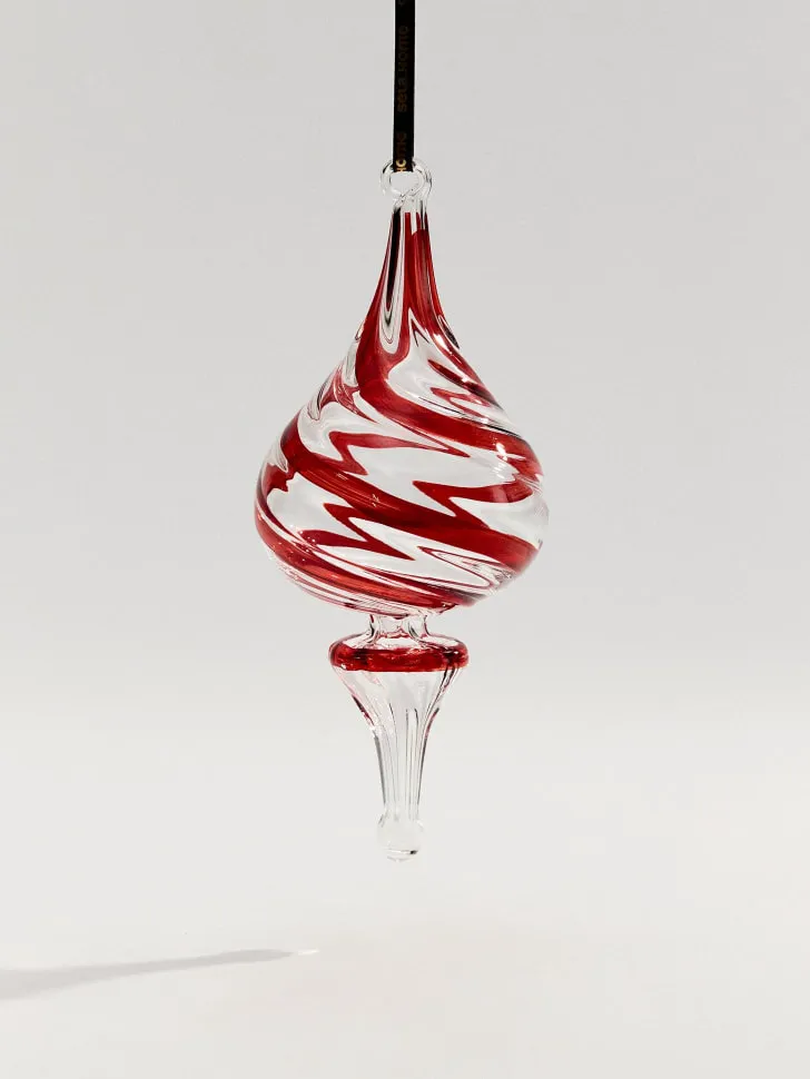 Представляем вашему вниманию изысканное елочное украшение из стекла, которое мгновенно преобразит вашу новогоднюю елку и весь праздничный интерьер. Это не просто игрушка, а настоящее произведение искусства, созданное для того, чтобы дарить волшебство и уют. Выполненное из высококачественного прозрачного стекла, оно украшено динамичными красными вихрями, которые придают ему особую элегантность и праздничный вид.