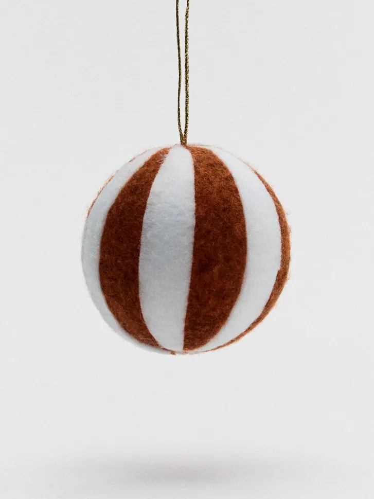 Позвольте себе окунуться в атмосферу праздника с нашим стильным елочным украшением! Этот очаровательный аксессуар станет идеальным дополнением к вашей новогодней елке, привнося в интерьер нотки тепла и уюта. Выполненное в элегантном полосатом дизайне, оно сочетает в себе классические коричневые и чистые белые оттенки, что позволяет ему гармонично смотреться как в традиционных, так и в современных декорациях, подчеркивая ваш изысканный вкус.