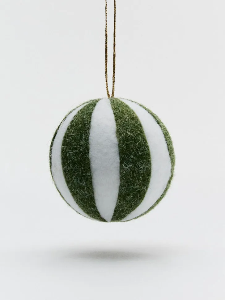 Приготовьтесь к самому волшебному времени года с нашим прекрасным елочным украшением! 🎄 Это стильное украшение добавит уюта и праздничного настроения вашему дому. Шарик выполнен из мягкого войлока в классическом сочетании зеленого и белого цветов, создавая неповторимый полосатый дизайн, который идеально впишется в любой интерьер. Золотистая нить для подвешивания подчеркивает его элегантность и готовность сразу же занять почетное место на вашей елке.