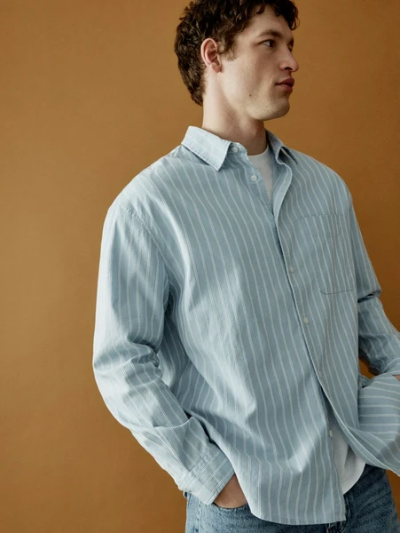 Голубая расцветка в тонкую белую полоску придает ей свежий и современный вид, легко вписываясь в любой кэжуал-стиль. Рубашка прекрасно сочетается с: