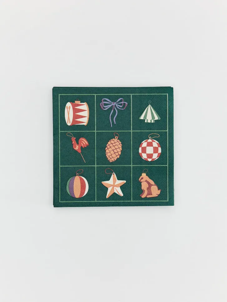 Приготовьтесь к праздникам с нашим эксклюзивным набором бумажных салфеток! Этот комплект из 20 штук станет идеальным дополнением к вашей праздничной сервировке, будь то Новый год, Рождество или любое другое торжественное событие. Каждая салфетка украшена очаровательными рисунками новогодних игрушек и символов, выполненных в теплых, уютных тонах на глубоком зеленом фоне, что мгновенно создает атмосферу волшебства и уюта.