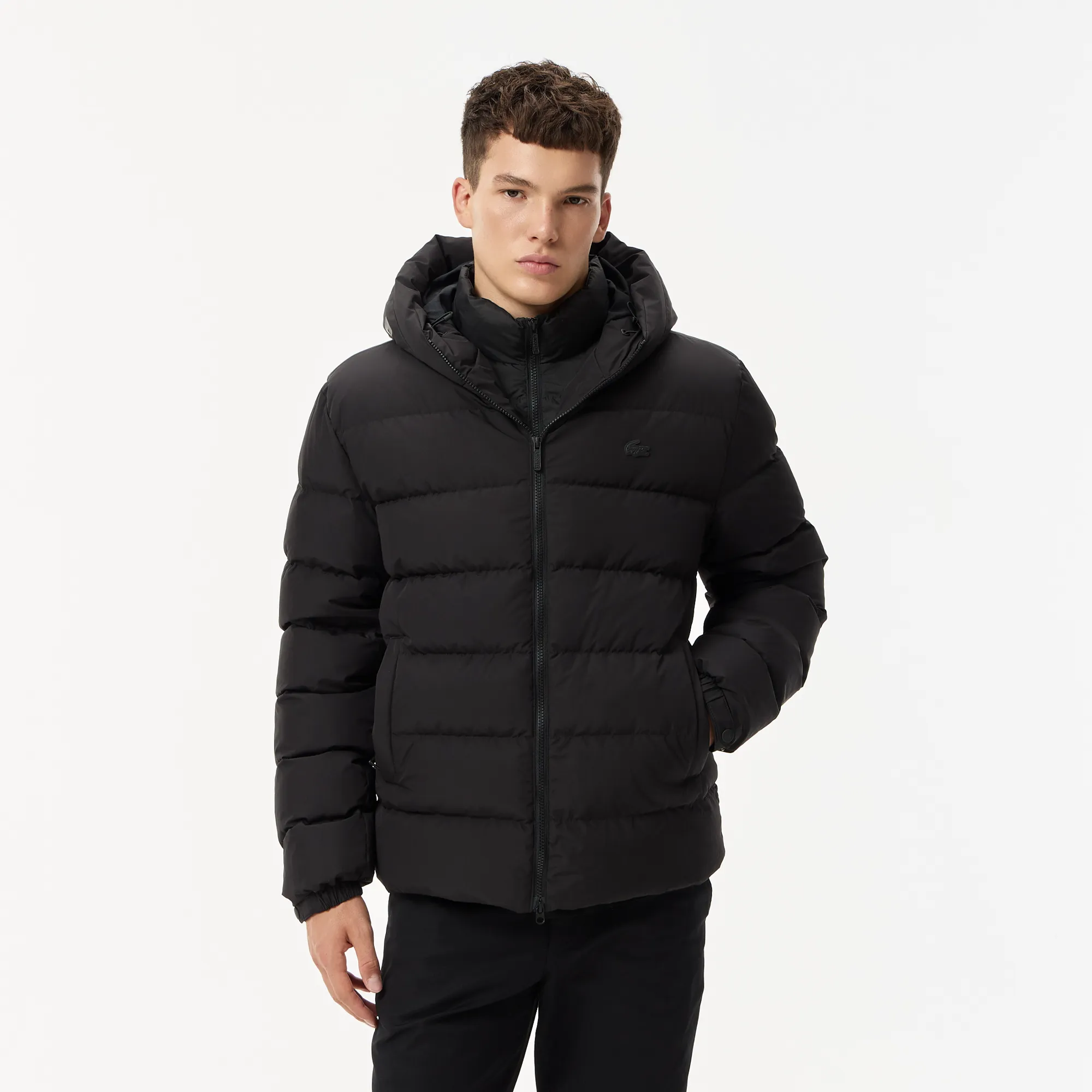 Мужской стёганый пуховик Lacoste с капюшоном, черный, арт. bh2527
