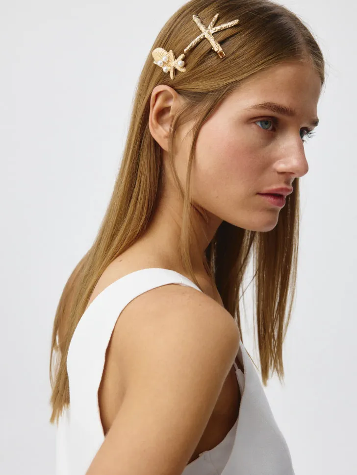 Представляем вашему вниманию эксклюзивный набор заколок для волос, вдохновленный красотой морских глубин. Этот комплект станет идеальным дополнением для тех, кто ценит утонченность и оригинальность в аксессуарах. В наборе представлены две элегантные заколки: одна в форме изящной морской звезды, а вторая – в виде стильной ракушки. Обе заколки выполнены в теплом золотисто-бежевом цвете и декорированы мелкими, деликатными жемчужными элементами, которые придают им особое сияние и шарм.