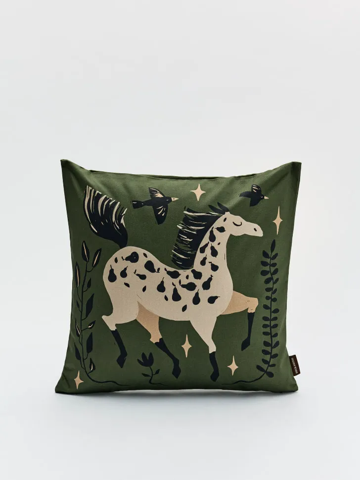 Особое внимание привлекает утонченный принт, изображающий грациозного коня в окружении мистических птиц и растительных мотивов. Такой дизайн превратит обычную подушку в настоящий арт-объект, способный оживить любой интерьер — от классики до бохо. Чехол легко снимается и стирается, сохраняя яркость красок и форму даже после многочисленных стирок. Прекрасный выбор для создания атмосферы тепла и гармонии в вашей гостиной, спальне или на террасе. Это не просто элемент декора, а инвестиция в стиль и уют вашего пространства.