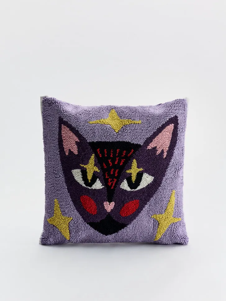 Представляем вашему вниманию эксклюзивный чехол для декоративной подушки, который мгновенно преобразит ваш интерьер и наполнит его уютом и оригинальностью. Этот уникальный аксессуар украшен детальной вышивкой, изображающей загадочного котика, окруженного сияющими звездами. Сочетание нежных лавандовых оттенков и ярких акцентов создает поистине волшебную атмосферу, идеально подходящую для любого современного или классического дизайна. Он станет центральным элементом декора, притягивающим взгляды и вызывающим улыбки, а его универсальный стиль легко впишется в различные цветовые палитры вашего дома.