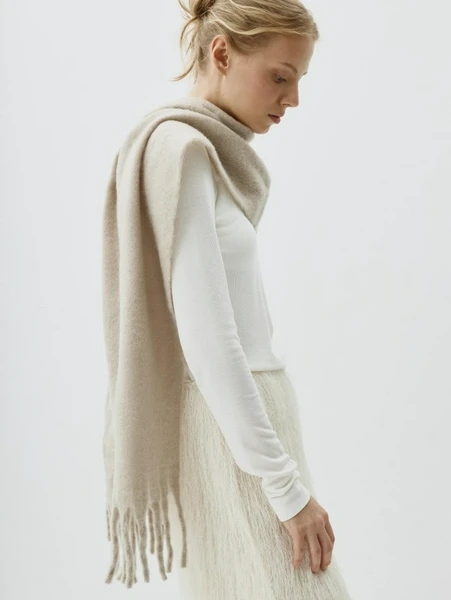 Шарф выполнен в универсальном светло-бежевом оттенке, который легко сочетается с любой верхней одеждой и цветовой палитрой вашего гардероба. Его объемная фактура позволяет экспериментировать с различными способами ношения: