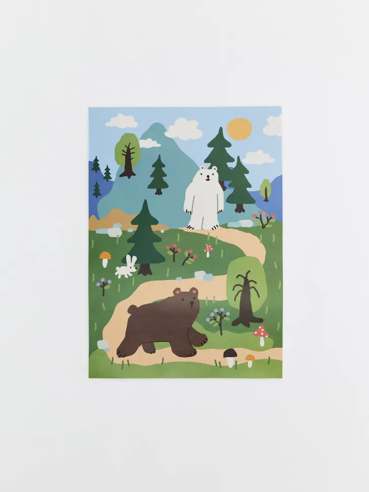 Представляем вашему вниманию удивительный детский постер, который превратит любую комнату в настоящий уголок сказки и приключений! Этот яркий и красочный элемент декора идеально подходит для оформления детской спальни, игровой зоны или творческого уголка. На постере изображены очаровательные лесные обитатели – большой бурый медведь, милый белый мишка и игривый зайчонок, прогуливающиеся по живописному лесу среди высоких елей, пышных деревьев и величественных гор. Светлое небо, ласковое солнце и множество деталей, таких как грибы и ягоды, делают эту иллюстрацию по-настоящему живой и увлекательной.