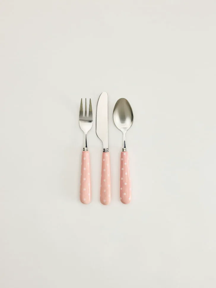 Представляем вашему вниманию уникальный набор детских столовых приборов, состоящий из 3 предметов! Этот комплект идеально разработан для самых маленьких, помогая им осваивать навыки самостоятельного приема пищи. В набор входят удобная вилка, безопасный нож и эргономичная ложка, размеры которых адаптированы специально для детских ручек. Рукоятки приборов выполнены в нежном розовом цвете с очаровательным узором в белый горошек, что делает каждый прием пищи веселым и приятным. Металлическая часть изготовлена из высококачественной нержавеющей стали, обеспечивающей долговечность, безопасность и легкость в уходе.