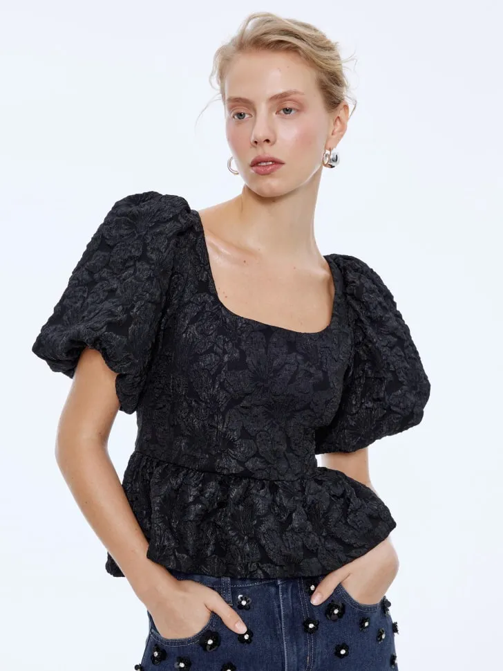 Представляем вашему вниманию роскошную блузу из тафты с изысканным жаккардовым принтом! Этот невероятно стильный элемент гардероба станет изюминкой вашего образа, подчеркивая утонченность и хороший вкус. Пышные рукава-фонарики придают силуэту особую выразительность и романтичность, а слегка приталенный крой с баской идеально садится по фигуре, создавая гармоничные пропорции.