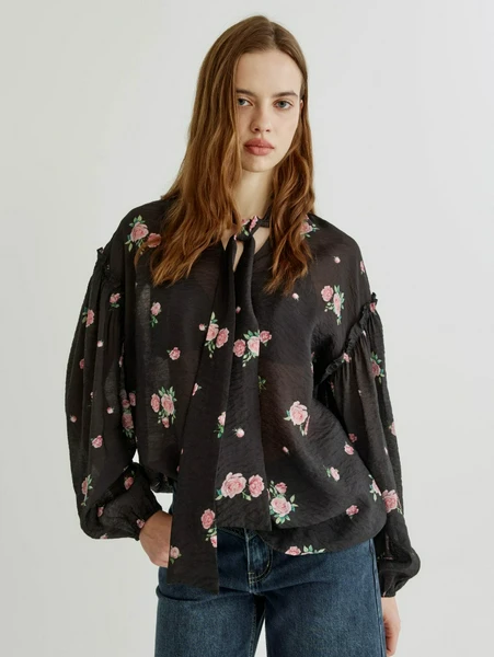 Блузы и рубашкиОчаровательная полупрозрачная блуза SELA с пышными рукавами – идеальный выбор для тех, кто ценит элегантность и комфорт. Эта модель выполнена в глубоком черном цвете, украшенном изысканным розовым цветочным принтом, что придает ей особую нежность и романтичность. 🌸 Пышные рукава с легкой сборкой у манжет создают воздушный и женственный силуэт, делая каждый образ неповторимым.
