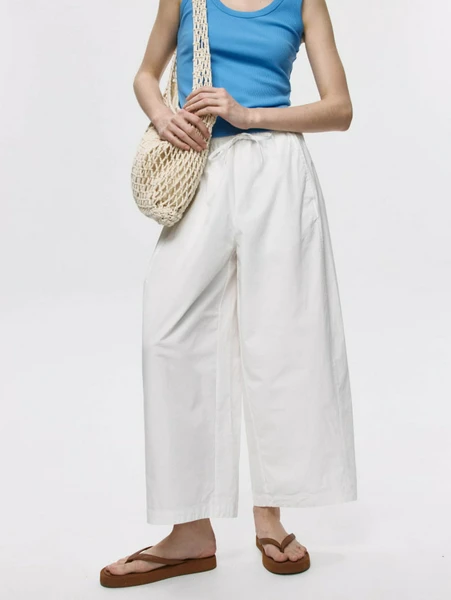 Изготовленные из 100% натурального хлопка, брюки приятны к телу и гипоаллергенны. Модель оснащена удобным эластичным поясом на кулиске, что позволяет регулировать посадку для идеального комфорта. Объемный силуэт и универсальный белый цвет открывают широкие возможности для стилизации: