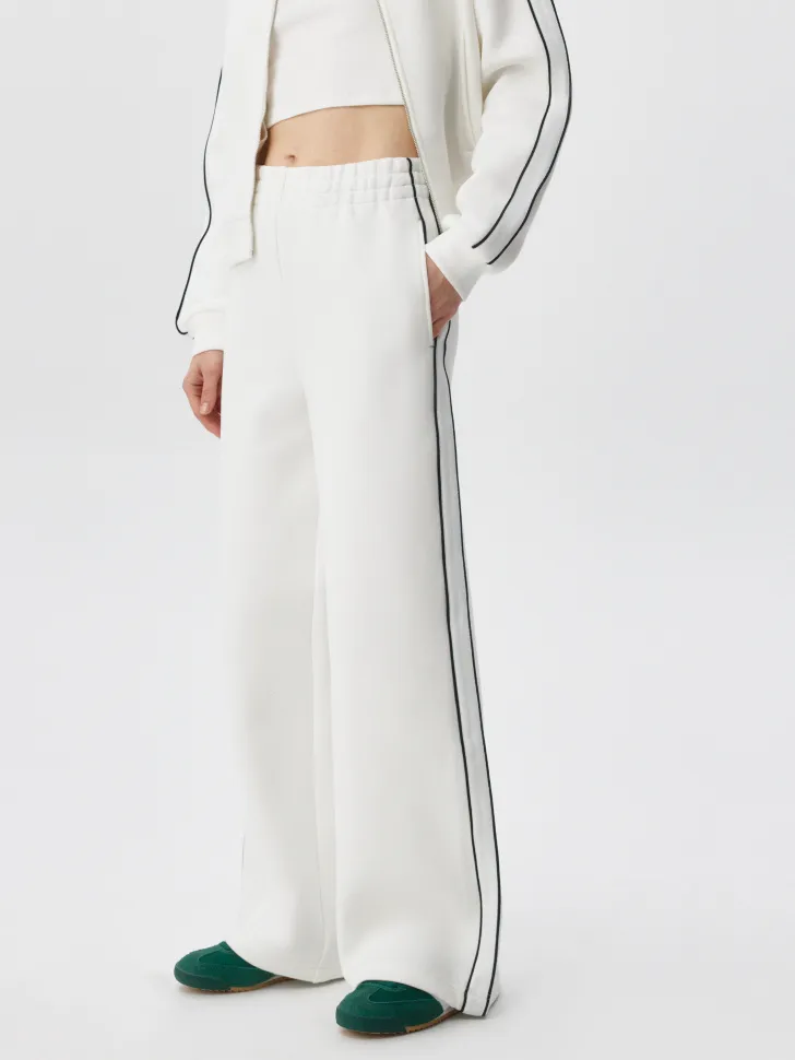 Выполненные из приятной к телу ткани, они обеспечивают максимальный комфорт в течение всего дня. Классические лампасы по бокам придают брюкам спортивный шик, делая их актуальными в любом сезоне. Сочетайте их с кроссовками для создания динамичного лука или с туфлями на каблуке для более изысканного вида. Добавьте любимый топ или объемный свитер, и ваш образ готов! Откройте для себя новые грани стиля с этими уникальными брюками.