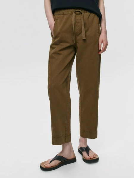 Благодаря свободному крою и укороченной длине, эти брюки идеально подходят для повседневной носки. Эластичный пояс на кулиске гарантирует идеальную посадку по фигуре и позволяет регулировать объем. Практичный оливковый цвет легко сочетается с разнообразными оттенками и стилями, делая их универсальным выбором для любого случая.