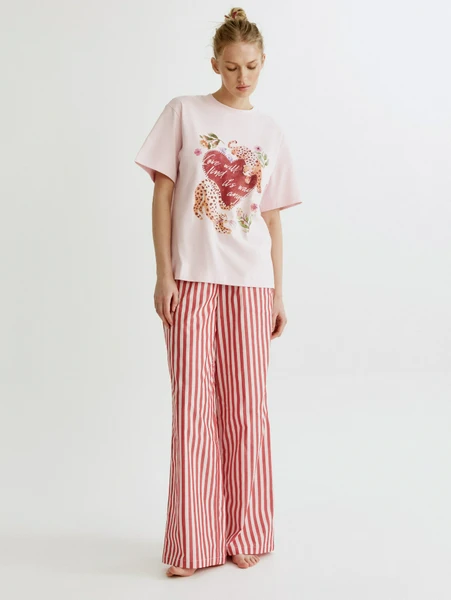 Дизайн брюк продуман до мелочей: классический прямой крой обеспечивает полную свободу движений, а эластичный пояс с регулируемым шнурком гарантирует идеальную и комфортную посадку на любой фигуре. Яркий и свежий красно-белый полосатый принт добавит нотку игривости и позитива в ваш домашний образ. Эти брюки идеально подходят для:
