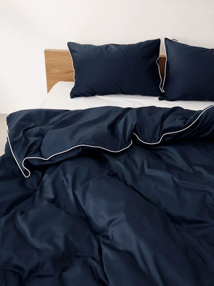 Откройте для себя идеальное сочетание стиля и комфорта с нашим комплектом постельного белья 1,5 спальный! Этот комплект, размером 140х200 см, создан, чтобы принести в вашу спальню атмосферу уюта и элегантности. Глубокий темно-синий цвет в сочетании с изящной белой окантовкой создает утонченный и современный дизайн, который легко впишется в любой интерьер, будь то классический или минималистичный.