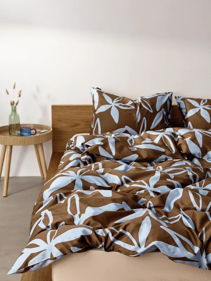 Комплект выполнен в благородном коричневом цвете с изящным голубым узором, который добавит нотку элегантности и спокойствия в ваш интерьер. Отсутствие простыни в комплекте дает вам свободу выбора – вы можете использовать уже имеющуюся или подобрать идеальную по цвету и фактуре.