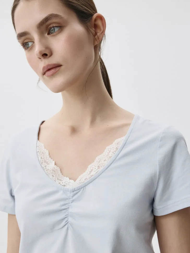 Погрузитесь в мир нежности и изысканного комфорта с нашей пижамной футболкой, украшенной деликатным кружевом. Эта модель создана для тех, кто ценит не только удобство, но и безупречный стиль в домашнем гардеробе. Изготовленная из высококачественного, дышащего материала, футболка обеспечивает максимальное расслабление и приятные ощущения на коже. Мягкая ткань позволяет телу дышать, предотвращая перегрев и обеспечивая спокойный и комфортный сон. Элегантное кружево по краю добавляет изделию утонченности и женственности, делая его прекрасным выбором не только для сна, но и для уютных домашних вечеров.