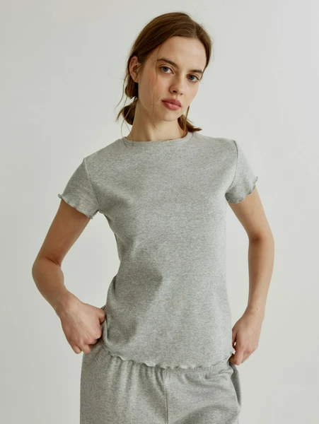Откройте для себя идеальное сочетание комфорта и стиля с нашей домашней футболкой SELA. Эта модель, выполненная из мягчайшего хлопка в модном сером меланжевом оттенке, станет незаменимой частью вашего гардероба для отдыха. Легкий и дышащий материал обеспечивает приятные ощущения в течение всего дня, а фактура в рубчик придает ей особый шарм и уютный вид. Волнистые края по низу и на рукавах добавляют игривости и нежности.