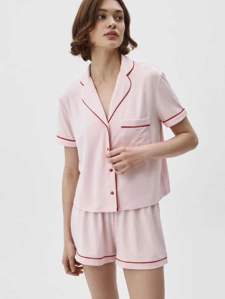 Комплект включает в себя элегантную рубашку с коротким рукавом и классическим воротником, а также свободные шорты, обеспечивающие полную свободу движений. Особую изюминку дизайну придают контрастные канты насыщенного бордового цвета, которые эффектно подчеркивают силуэт и добавляют нотку утонченности нежному розовому оттенку. Это не просто пижама, это ваш личный оазис спокойствия и стиля. Идеально подходит для уютных вечеров, утреннего пробуждения или просто для того, чтобы чувствовать себя прекрасно дома. Наша трикотажная пижама — это инвестиция в ваш комфорт и хорошее настроение.