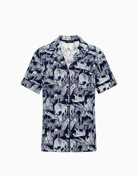 Особое очарование рубашке придает эксклюзивный принт: детализированные изображения слонов, тигров и пышной тропической листвы на глубоком темно-синем фоне. Этот рисунок делает каждую рубашку уникальной и придает вашему образу загадочность и элегантность. Модель PD856 идеально подходит как для повседневной носки, так и для создания расслабленного вечернего образа. Сочетайте ее с: