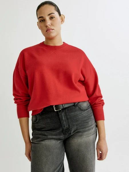 Яркий красный цвет добавит энергии вашему образу, а свободный крой оверсайз позволяет легко комбинировать его с различными элементами гардероба – от повседневных джинсов до элегантных юбок.