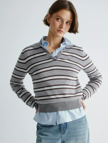 Джемперы, свитеры и кардиганыОткройте для себя идеальное сочетание стиля и комфорта с джемпером-поло SELA в контрастную полоску. Этот уникальный элемент гардероба создан для тех, кто ценит элегантность в повседневных образах.