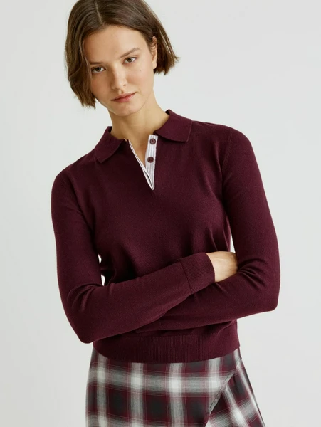 Откройте для себя изысканный комфорт с джемпером-поло от Sela! Этот элегантный джемпер глубокого бордового цвета идеально впишется в гардероб современной женщины, ценящей стиль и уют.