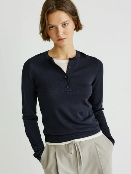 Откройте для себя идеальное сочетание стиля и комфорта с джемпером Sela! Этот элегантный темно-синий джемпер разработан специально для современных женщин, ценящих универсальность и качество. Модель с длинными рукавами и круглой горловиной, дополненной стильной планкой на пуговицах, станет незаменимой вещью в вашем гардеробе.