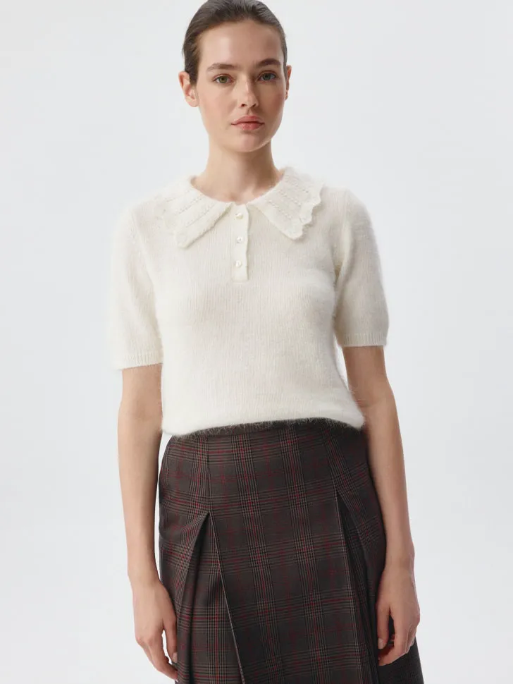 Откройте для себя идеальное сочетание комфорта и элегантности с нашим вязаным поло из смесовой шерсти. Это изделие, выполненное в нежном молочном оттенке, станет незаменимой частью вашего гардероба. Особое очарование ему придает изысканный ажурный воротник, который добавляет нотку ретро-шарма и утонченности. Мягкая и приятная к телу смесовая шерсть гарантирует тепло и уют в прохладное время года, делая его идеальным выбором для осени и зимы.