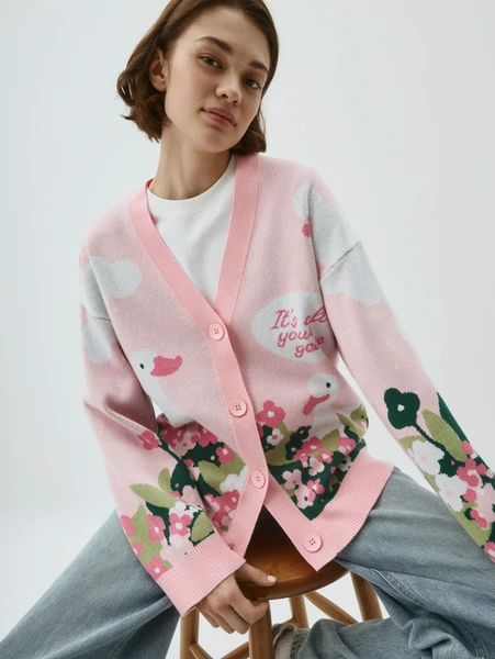 Представляем вашему вниманию уютный вязаный кардиган от Sela — идеальный выбор для создания стильных и комфортных образов в демисезон. Этот кардиган сочетает в себе нежность розового оттенка и оригинальный принт, который точно привлечет взгляды, добавив изюминку в ваш гардероб.