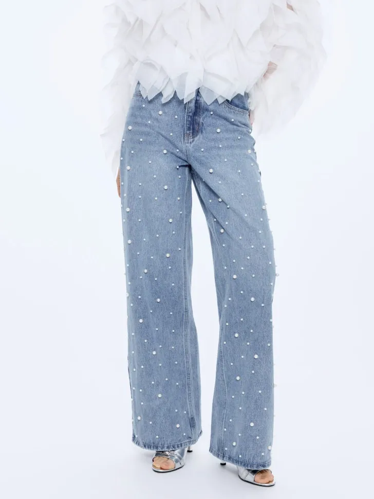 Джинсы Boyfriend c декором из жемчужных бусин, голубой, белый, арт. art001