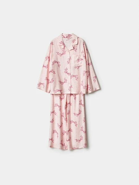 Легкий, дышащий материал в нежном светло-розовом оттенке дополнен очаровательным принтом в виде милых бантов, который обязательно понравится вашей дочке. Свободный крой не стесняет движений, обеспечивая полную свободу во время отдыха. Эта пижама станет идеальным выбором для: