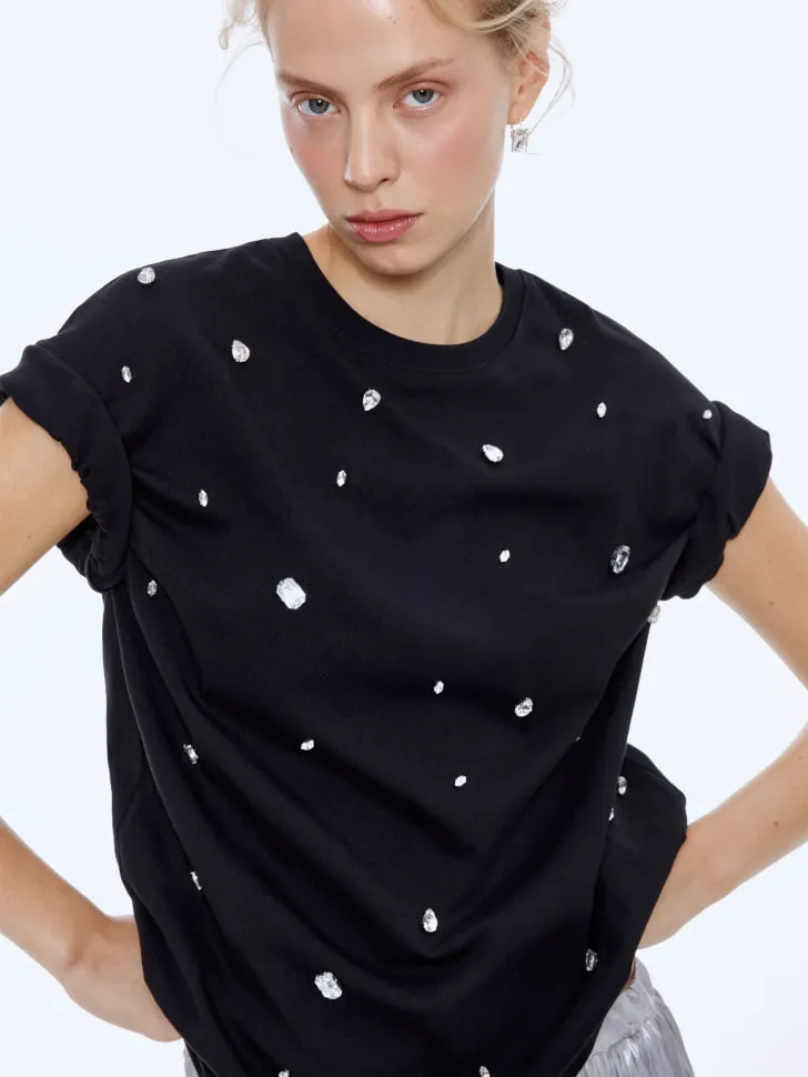 Футболка оверсайз с декором из камней, черный, арт. n/a
