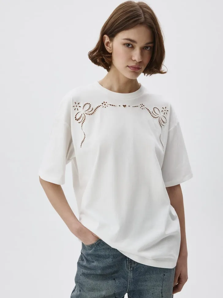 Эта футболка станет незаменимой основой для множества образов: сочетайте ее с любимыми джинсами для создания расслабленного городского стиля, или добавьте элегантную юбку и аксессуары для более вечернего выхода. Благодаря своей универсальности и актуальному дизайну, она легко впишется в любой гардероб и подчеркнет вашу индивидуальность. Выбирайте качество, комфорт и безупречный стиль – выберите нашу футболку оверсайз с кружевным узором и будьте в центре внимания!