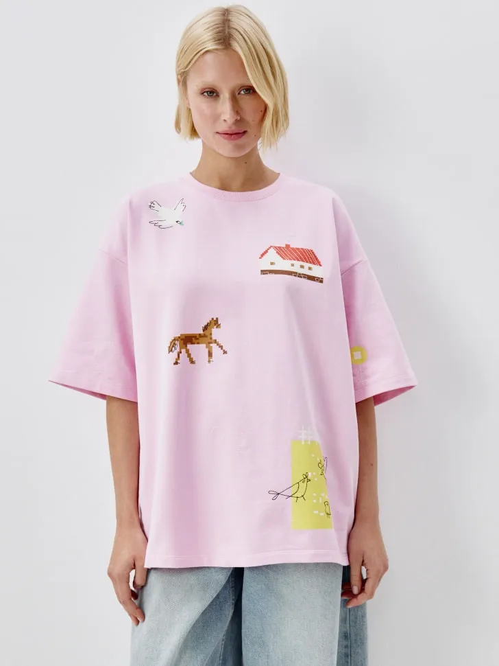 Откройте для себя идеальное сочетание комфорта и оригинальности с нашей новой футболкой оверсайз! Эта модель, выполненная в нежном розовом оттенке, подарит вам ощущение легкости и стиля на весь день. Ее уникальность заключается в тщательно продуманном дизайне: лицевую сторону украшает эксклюзивный принт, дополненный детальной вышивкой, изображающей милую лошадку, уютный домик и забавных птичек среди абстрактных форм.