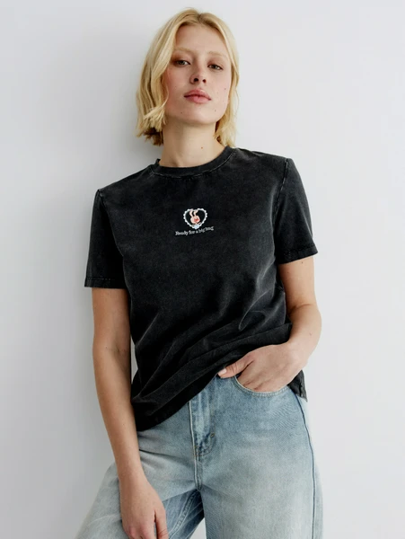 Центральным элементом дизайна является очаровательный принт с персонажем из любимого мультфильма "Союзмультфильм", заключенный в сердце и дополненный вдохновляющей надписью "He made my day". Этот элемент не только украшает футболку, но и вызывает теплые воспоминания, добавляя образу игривости и позитива. Футболка имеет классический крой и круглый вырез, обеспечивающие комфортную посадку. Это идеальный выбор для повседневного использования: