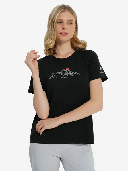 Представляем женскую футболку Northland — ваш идеальный выбор для активного отдыха и повседневной носки! Эта стильная футболка черного цвета, украшенная оригинальным горным пейзажем, станет незаменимым элементом вашего гардероба. Ее свободный покрой гарантирует максимальный комфорт и полную свободу движений, что особенно важно во время походов или других видов активности.
