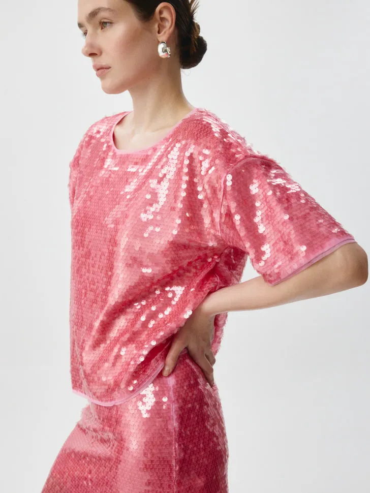 Каждая пайетка на этом топе поймает свет и заставит вас блистать, будь то на танцполе, на летней террасе или на любом другом торжественном мероприятии. Укороченный крой идеально сочетается с брюками и юбками с высокой посадкой, создавая гармоничный и модный силуэт. Комбинируйте его с массивными украшениями или оставьте его в качестве единственного акцента – в любом случае, эффект будет потрясающим. Почувствуйте себя настоящей дивой и подарите себе этот искрящийся элемент гардероба, который никого не оставит равнодушным!
