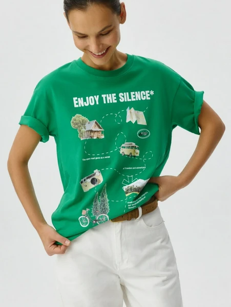 Эта модель, выполненная в ярком зеленом цвете, станет акцентом вашего гардероба. Оригинальный принт с надписью "ENJOY THE SILENCE*" и мотивами природы и путешествий (уютный дом, ретро-кемпер, фотоаппарат, велосипед) вдохновляет на расслабление и приключения. Свободный крой оверсайз обеспечивает