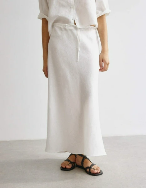 Изготовленная из 100% премиального льна, юбка обеспечивает невероятную легкость и воздухопроницаемость. Натуральная ткань прекрасно пропускает воздух, даря ощущение свежести даже в самый знойный день. Белый цвет делает юбку универсальной, позволяя создавать множество стильных образов, от повседневных до более нарядных.