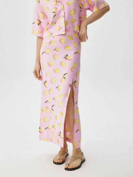 Яркий и жизнерадостный лимонный принт на нежно-розовом фоне моментально привлекает внимание, делая эту юбку акцентной деталью вашего гардероба. Длина макси и элегантный разрез сбоку добавляют образу женственности и свободы движений. Юбка Sela станет вашей любимой вещью для: