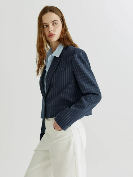 Откройте для себя совершенство стиля с однобортным укороченным жакетом от SELA. Эта модель — воплощение элегантности и современных трендов, созданная для тех, кто ценит безупречный вкус и комфорт. Представленный в глубоком темно-синем цвете с утонченной полоской, жакет станет акцентной деталью любого ансамбля.