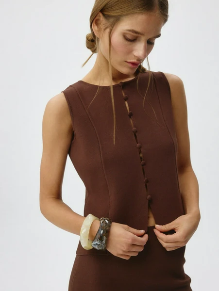 Выполненный из высококачественной, приятной на ощупь пряжи, жилет обеспечивает исключительный комфорт и мягкость. Его глубокий, насыщенный коричневый оттенок универсален и легко комбинируется с различными элементами вашего гардероба – от строгих офисных рубашек до легких блузок и базовых футболок. Продуманный крой и внимание к деталям подчеркнут достоинства фигуры, а застежка на пуговицы спереди добавляет функциональности и особого шарма. Этот жилет — это не просто одежда, это инвестиция в ваш уникальный стиль и комфорт на каждый день.