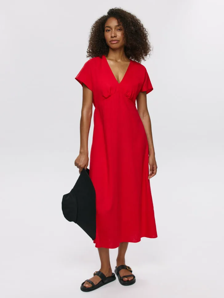 Элегантный крой миди универсален и подходит для любой фигуры, подчеркивая женственность и даря свободу движений. Насыщенный красный цвет платья не только притягивает взгляды, но и добавляет яркости в ваш повседневный или праздничный гардероб. V-образный вырез деликатно акцентирует линию декольте, а свободный силуэт гарантирует комфорт на протяжении всего дня. Это платье станет вашей незаменимой основой для создания стильных и неповторимых образов – комбинируйте его с босоножками для романтической прогулки или с кедами для активного дня. Создайте свой уникальный стиль с этим универсальным и невероятно комфортным платьем!