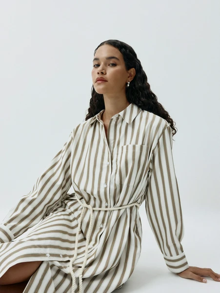 - Актуальный принт: Стильные полоски в натуральных оттенках бежевого и хаки легко сочетаются с любыми аксессуарами.