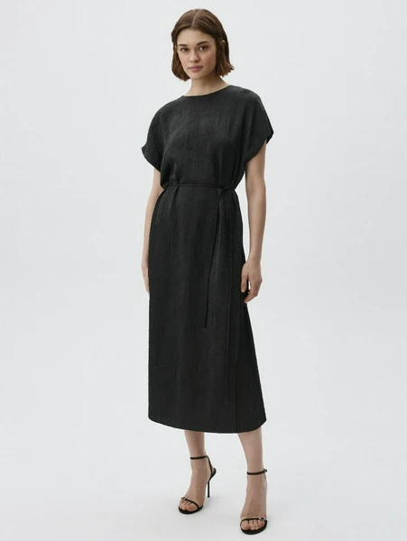 Модель выполнена в классическом черном цвете, который всегда остается актуальным и легко комбинируется с другими оттенками. Жатый сатин не только выглядит роскошно, но и очень приятен к телу, обеспечивая максимальный комфорт в течение всего дня. Легкий и дышащий материал практически не мнется, что особенно ценно в динамичном ритме современной жизни. Платье имеет комфортный крой миди и дополняется поясом, который элегантно подчеркивает линию талии, создавая женственный силуэт. Короткие рукава добавляют легкости и непринужденности образу. Выбирайте Sela для безупречного стиля и комфорта!