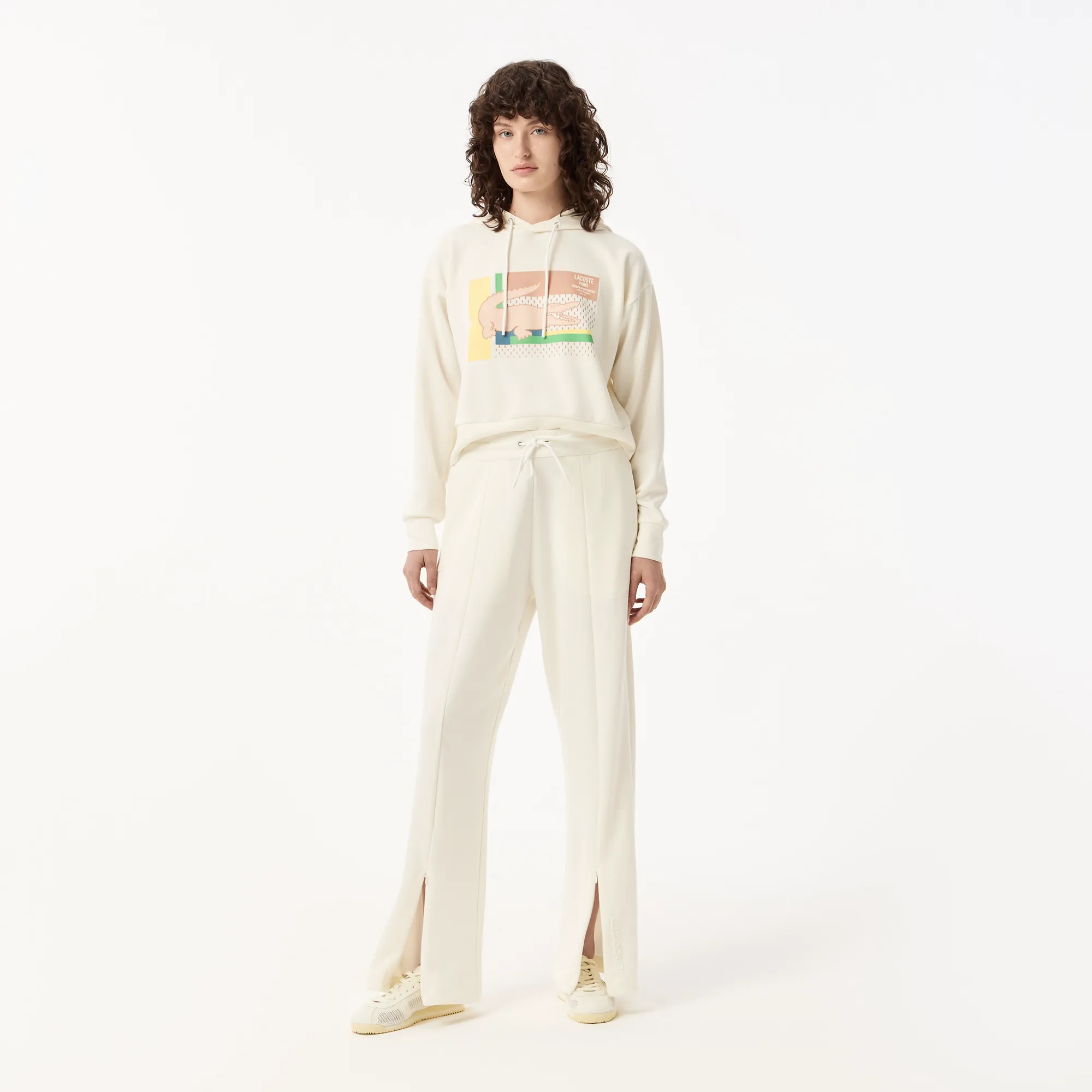 Представляем вашему вниманию женские спортивные брюки Lacoste – идеальное воплощение французского шарма и спортивной практичности. Эти брюки созданы для современных женщин, которые не готовы идти на компромиссы между стилем и комфортом. Выполненные в свежем белом цвете, они станут ярким акцентом в вашем гардеробе, легко сочетаясь как с кроссовками, так и с более повседневной обувью.