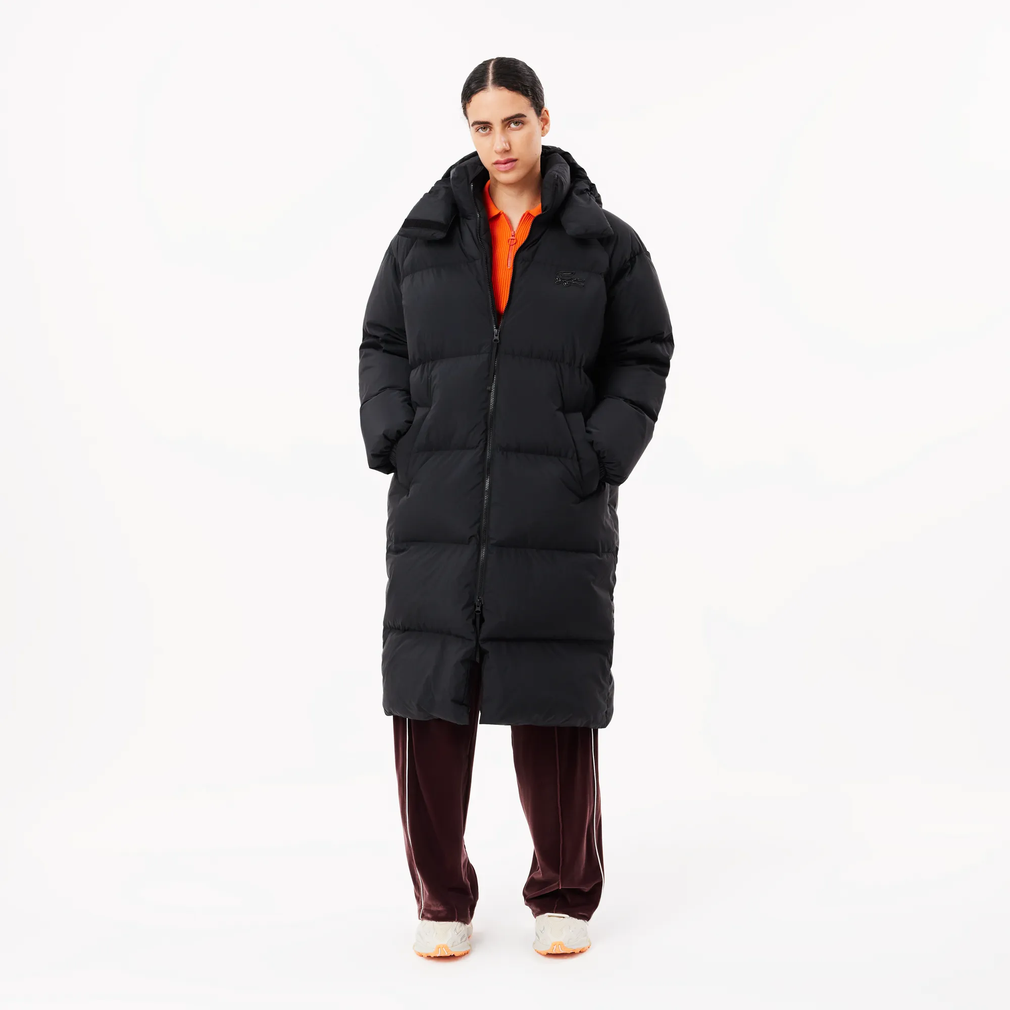 Женский длинный пуховик Lacoste с капюшоном, черный, арт. bf3522