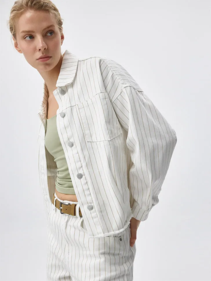 Оригинальный полосатый принт добавляет изысканности и подчеркивает уникальность вашего стиля. Изготовленная из высококачественного денима, куртка отличается не только привлекательным внешним видом, но и превосходной износостойкостью. Она идеально подходит для прохладных летних вечеров, осенних прогулок или в качестве стильного дополнения к многослойному образу. Комбинируйте ее с любимыми джинсами, юбками или платьями, чтобы создать неповторимый лук. Инвестируйте в качество и стиль, которые будут радовать вас не один сезон! Эта куртка – ваш шаг к совершенству повседневного гардероба.